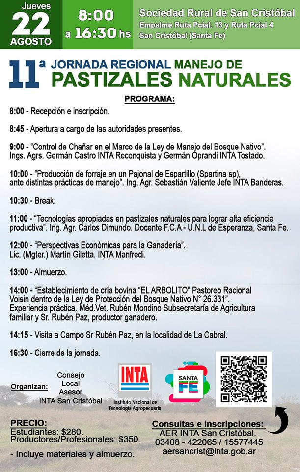 Desde la agencia INTA promocionan esta tradicional charla para productores, profesionales y estudiantes. La misma estará dentro del programa estipulado en la ExpoTotal el día jueves 22 de 8hs a 16.30hs. El precio de esta jornada es de $350 para productores y profesionales, y de $280 para estudiantes.