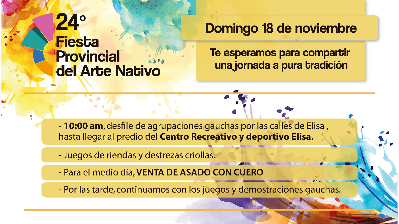 24° Fiesta Provincial del Arte Nativo 20 noviembre, 2018 El domingo Elisa disfrutó de una extensa jornada de actividades en el marco de su festival provincial. Cerca de 3000 personas asistieron al evento realizado en el CRyDE.