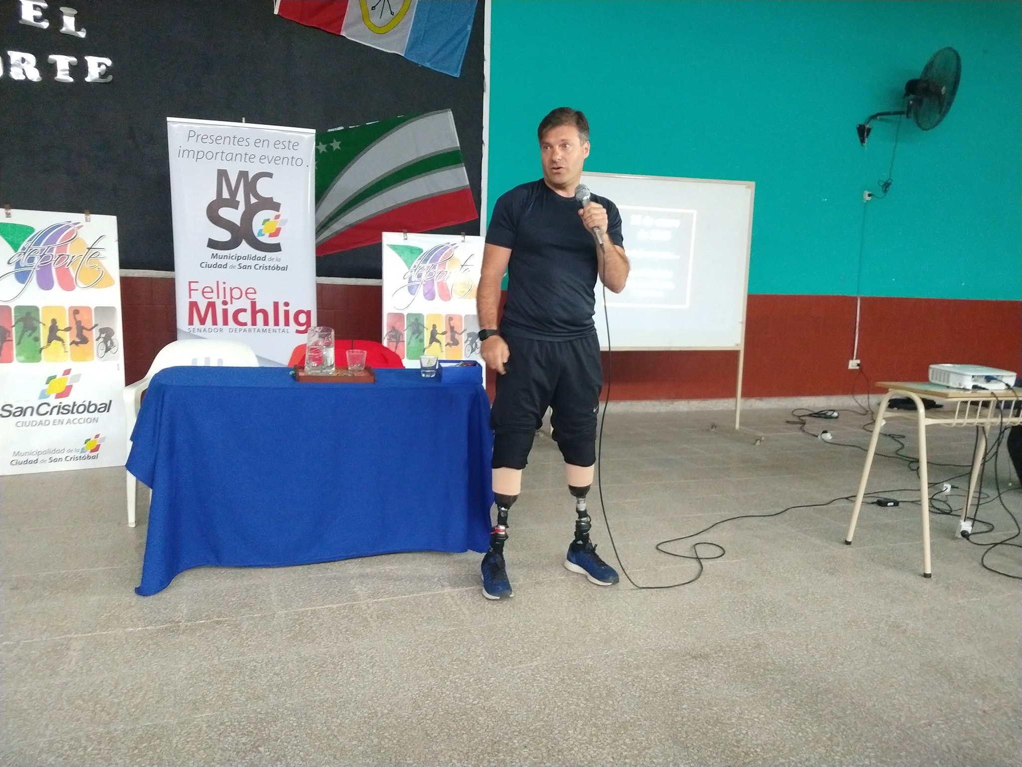 Ayer se llevó a cabo una nueva jornada del programa que realiza la municipalidad junto con la secretaría de deportes y el Senador Felipe Michlig. En esta ocasión el invitado especial fue Pablo Giesenow, que practica el deporte intensamente desde que sufrió un accidente de tránsito donde perdió sus 2 piernas. A partir de allí Pablo se volcó al deporte y realiza charlas en distintos lugares, dando un mensaje de superación y siendo un ejemplo no solo del deporte sino también de la vida. En esta jornada Pablo dió una charla con alumnos de escuelas primarias en el la escuela Rivadavia, luego estuvo en la pista de atletismo bicicleteando con el grupo de Los Levanta Tierra y charlando con alumnos de escuelas secundarias, y terminó el día en el playón municipal realizando actividades con las escuelitas de fútbol de Independiente y Ferro.