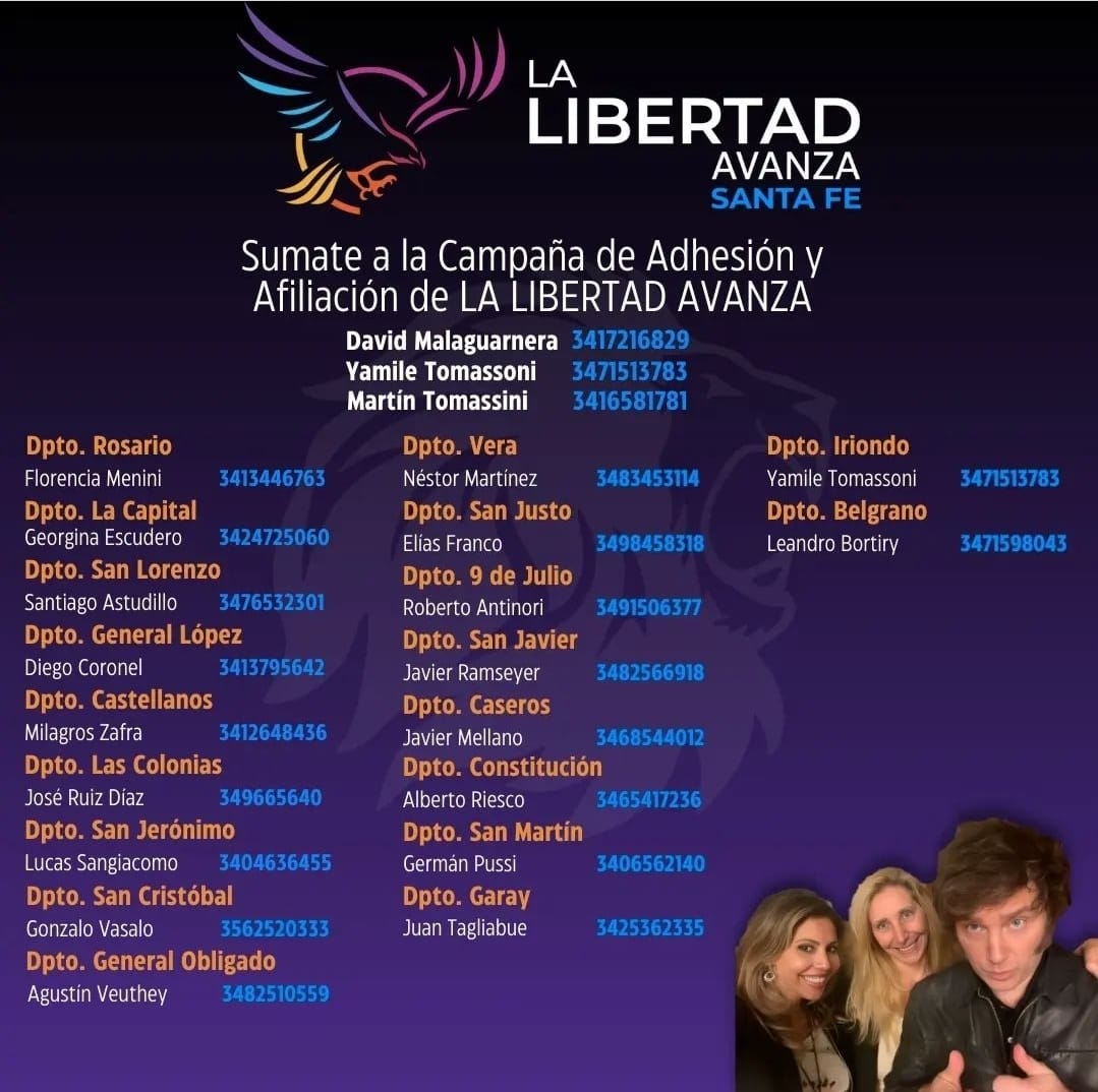 Campaña de afiliación de la libertad avanza 3 mayo, 2024 Desde el grupo sancristobalense realizan la campaña de afiliaciones con el objetivo de formar de manera oficial el espacio político, y así poder sumar herramientas y comenzar a actuar de manera activa en la política local.
