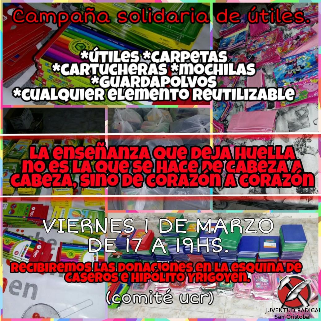 Campaña solidaria de útiles 1 marzo, 2019 Los chicos de la juventud radical realizan una colecta escolar, la campaña dura hasta el inicio de clases y la gente que quiera colaborar puede acercar las donaciones al comité de la UCR, ubicado en Hipólito Yrigoyen y Caseros.