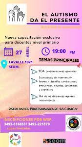 El próximo jueves 27 de abril, en el Auditorio del SEOM de Rafaela, se llevará a cabo una capacitación denominada “El Autismo da el presente”.  Dicha jornada dará comienzo a las 19. 00 y será exclusiva para docentes del nivel primario de la región. Los temas que se abordarán serán variados, entre ellos: “Estrategias de intervención frente a desafíos conductuales, emocionales, sociales, sensoriales y cognitivos” y “El rol de los diferentes agentes intervinientes”.  La capacitación pretende dar información a la comunidad educativa frente a distintas situaciones tales como pensar cuando están frente a un niño con este trastorno; cómo ellos perciben el entorno y, por lo tanto, comprender cómo acceder a ellos con estrategias concretas que faciliten su proceso educativo. Malena Díaz, integrante del grupo organizador, da más detalles acerca de esta jornada.