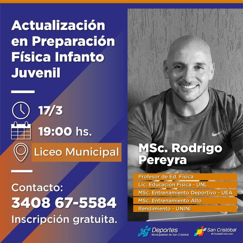 Este viernes llega a la ciudad una capacitación sobre preparación física infanto juvenil, a cargo del MSc Rodrigo Pereyra, donde se abordarán temas científicos y pediátricos como metodología de trabajo en la edad infantil. Esta disertación estará destinada a Profesores, entrenadores, Preparadores Físicos, interesados en la materia, publico en general. La inscripción es libre y gratuita. El evento se desarrollará en el Liceo Municipal.