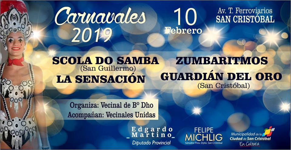 Anoche se presentaron oficialmente los Carnavales de Barrio Dho, la vecinal que organiza junto con vecinales unidas de San Cristóbal informó cómo se desarrollará el evento el día domingo, a partir de las 21:30 hs. El corsodromo estará sobre avenida de los Trabajadores Ferroviarios entre las calles Hipólito Yrigoyen y Saavedra, y se pide como entrada un alimento no perecedero. Lo colectado será destinado al C.A.F. y a la Casita del Niño de nuestra ciudad.
