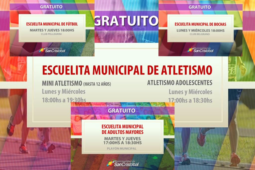 Comenzaron las escuelitas deportivas 9 abril, 2019 Bochas, Fútbol y Atletismo son las disciplinas que comenzaron con la actividad. Este año además, se anexa una escuelita de adultos mayores, debido a la masiva convocatoria que hubo en el proyecto «Verano en mi Ciudad».