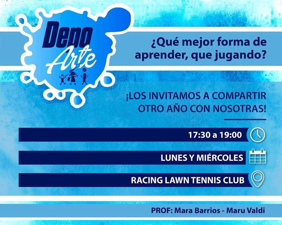 Se encuentran abiertas las inscripciones a la escuelita «Depo Arte», uno de los programas educativos y de recreación infantil con más llegada, los días de actividad son los lunes y miercoles de 17:30 a 19hs, en el Racing LTC.