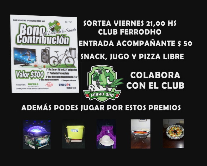 «El lorito de la suerte» 10 enero, 2019 Mañana a partir de las 21hs se sortea el bono contribución del Club Cultural y Deportivo Ferro Dho. Durante el sorteo va a haber un agasajo para los participantes y más sorteos durante esa noche.