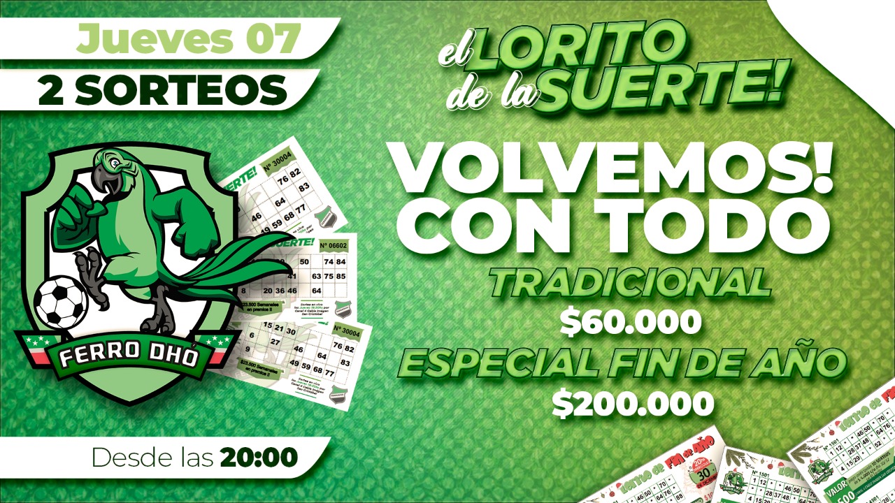 El Club Deportivo y Cultural Ferro Dho comunica que este Jueves se llevará a cabo el sorteo tradicional del Lorito de la Suerte, y además se hará el sorteo que estaba programado para fin de año y que no pudo realizarse por motivos sanitarios. Todavía hay tiempo para comprar los cartones.