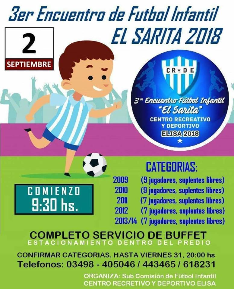 Encuentro de escuelitas en Elisa 31 agosto, 201831 agosto, 2018 Este fin de semana se juega el 3er encuentro de escuelitas organizado por el CRyDE Elisa.