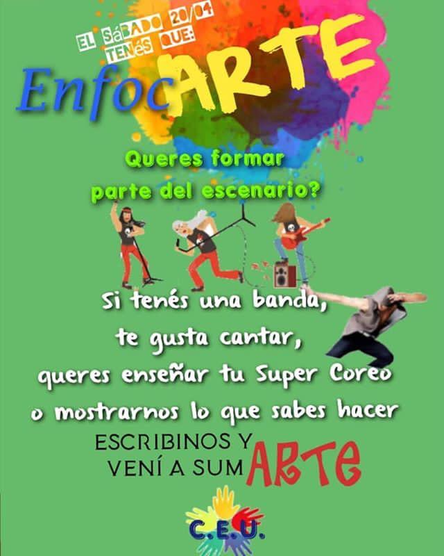 «ENFOCARTE» 17 abril, 2019 El Centro de Estudiantes Unidos organiza para este sábado a las 16hs en la Plazoleta Almirante Brown, un evento destinado a los artistas de la ciudad. Para más información pueden contactarse en las redes sociales del centro.