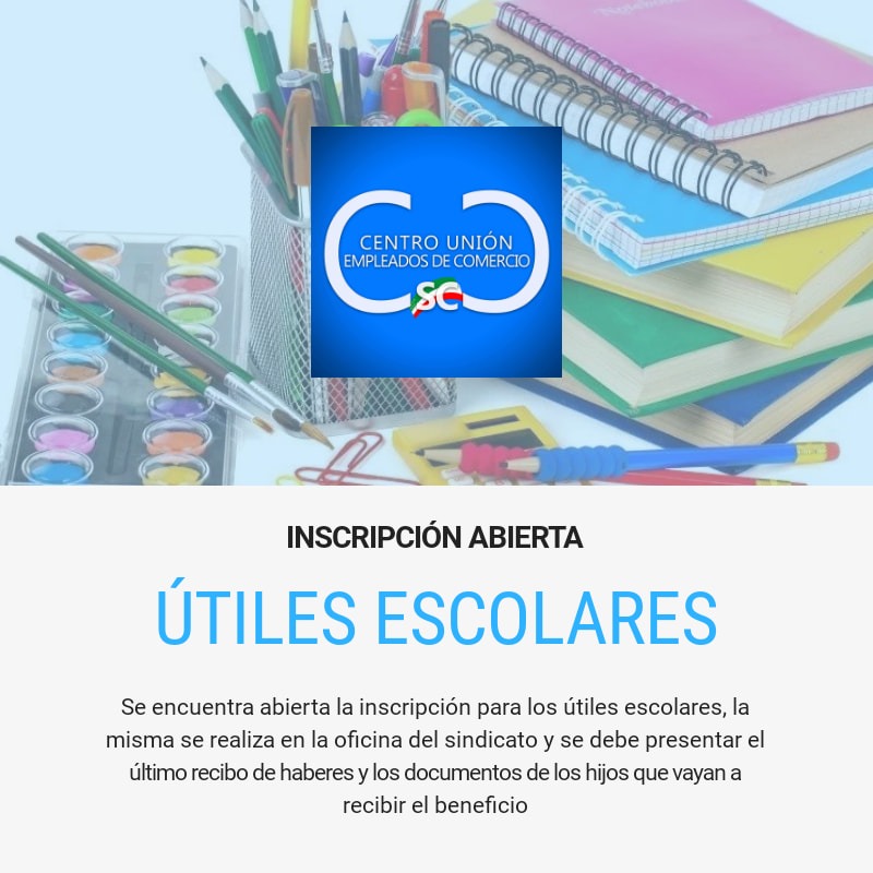 Inscripción abierta para útiles escolares 6 febrero, 2019 El Centro Unión Empleados de Comercio informa que ya se encuentra abierta la inscripción para los útiles escolares. Presentarse en la oficina del sindicato con el último recibo de haberes y los documentos de los hijos que reciban el beneficio.
