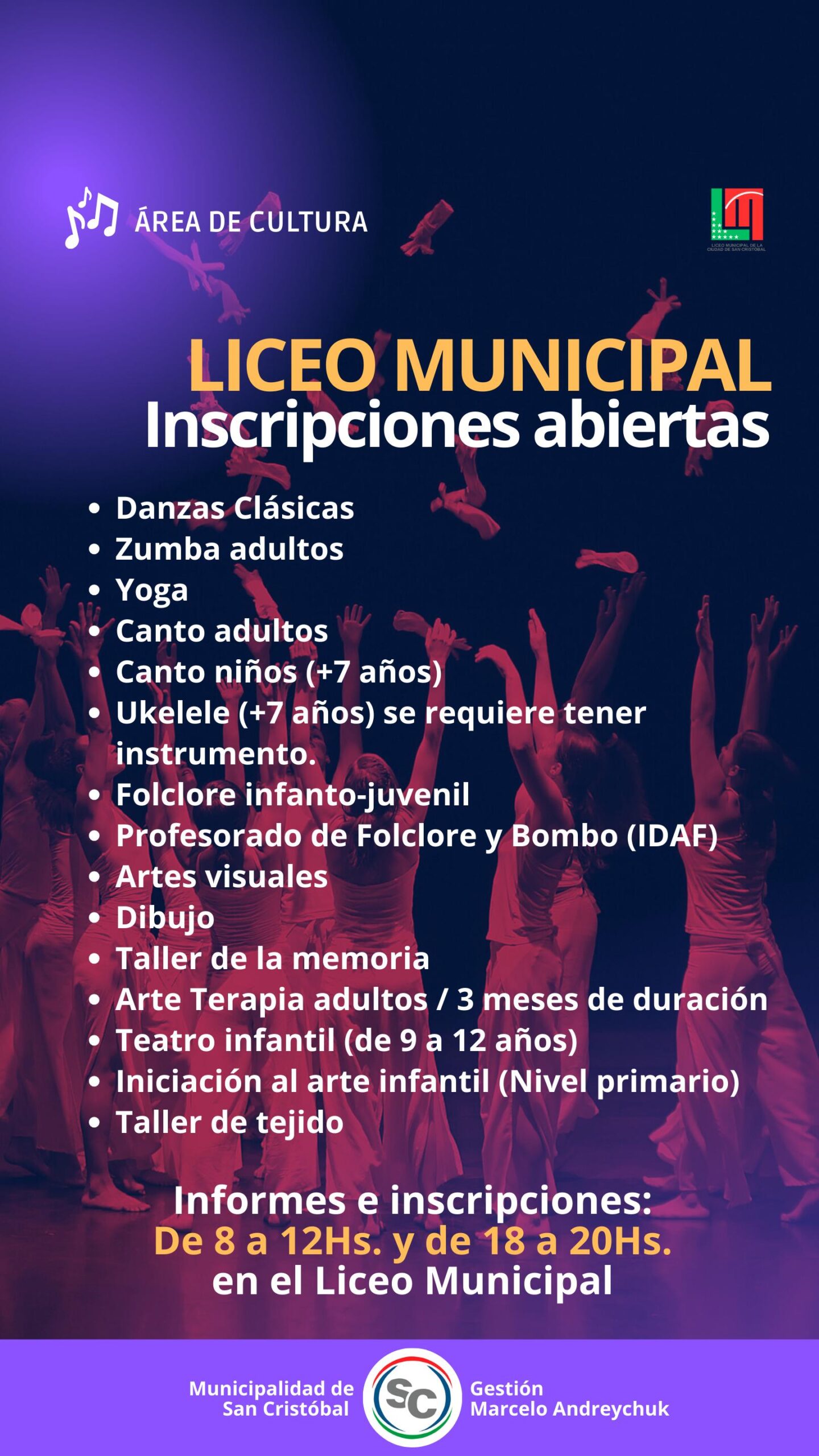 Inscripciones a los talleres del Liceo Municipal 25 febrero, 2025 Desde la Coordinación de Cultura Municipal dan detalles de los talleres que se encuentran con inscripciones abiertas, y las actividades que en lo pronto también estarán habilitadas para anotarse.