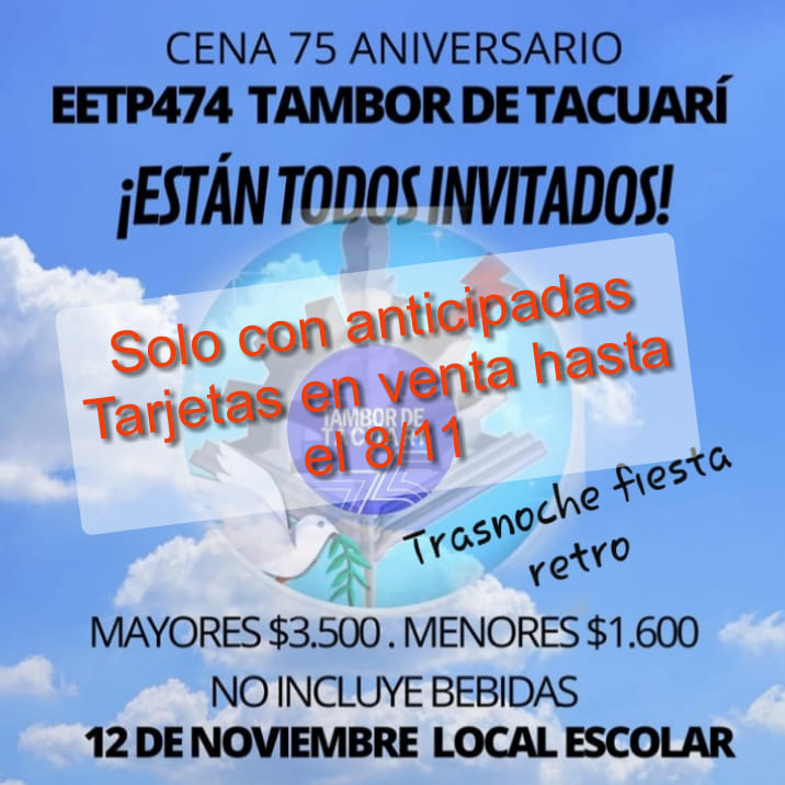 La Escuela Tambor de Tacuarí N⁰ 474 cumple 75 años y realiza su cena aniversario el próximo 12 de Noviembre. Ya están a disposición las tarjetas para compartir una noche de celebración en la institución educativa.