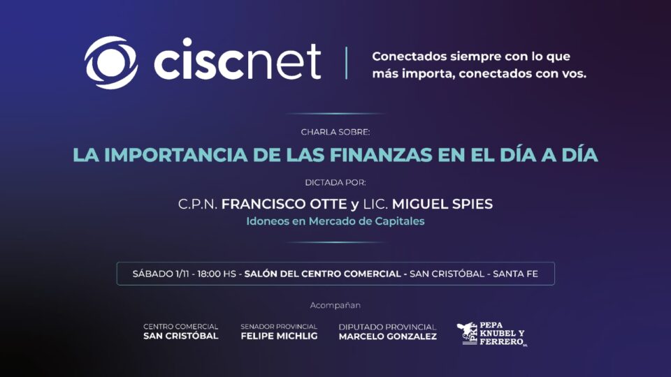 «La importancia de las finanzas en el día a día» 22 octubre, 2025 Organizada por CISCNET, los profesionales Francisco Otte y Miguel Spies estarán disertando en el Centro Comercial local el próximo 1 de noviembre.