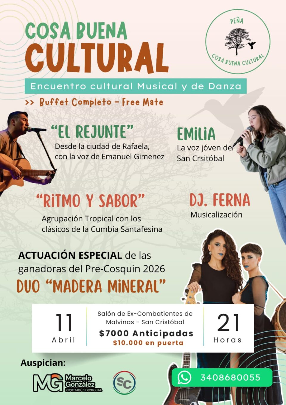 Nueva peña «Cosa Buena Cultural» 8 abril, 2026 El grupo organizador anticipa un gran espectáculo para el próximo sábado, en el Centro de Ex Combatiente y Familiares de Caídos en Malvinas. Las anticipadas ya están a la venta