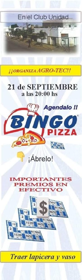 Nueva actividad organizada por los alumnos del último año de la escuela 474 y 339 para este sábado, a partir de las 20hs en el salón del Club Unidad Sancristobalense. El valor de la entrada tiene un valor de $50. Hay una gran variedad de premios en juego. Lo recaudado será destinado al fondo común que tienen ambas instituciones para realizar la fiesta de egresados en conjunto.