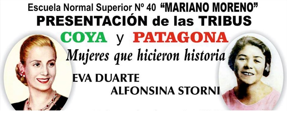 Presentación de Coyas y Patagones 7 noviembre, 2018 A partir de las 20:30hs en el patio de la Escuela N°40, ambas tribus presentaran sus temas como cierre de las competencias, la tribu Coya representará a Alfonsina Storni, mientras que la tribu Patagón representará a Eva Perón.