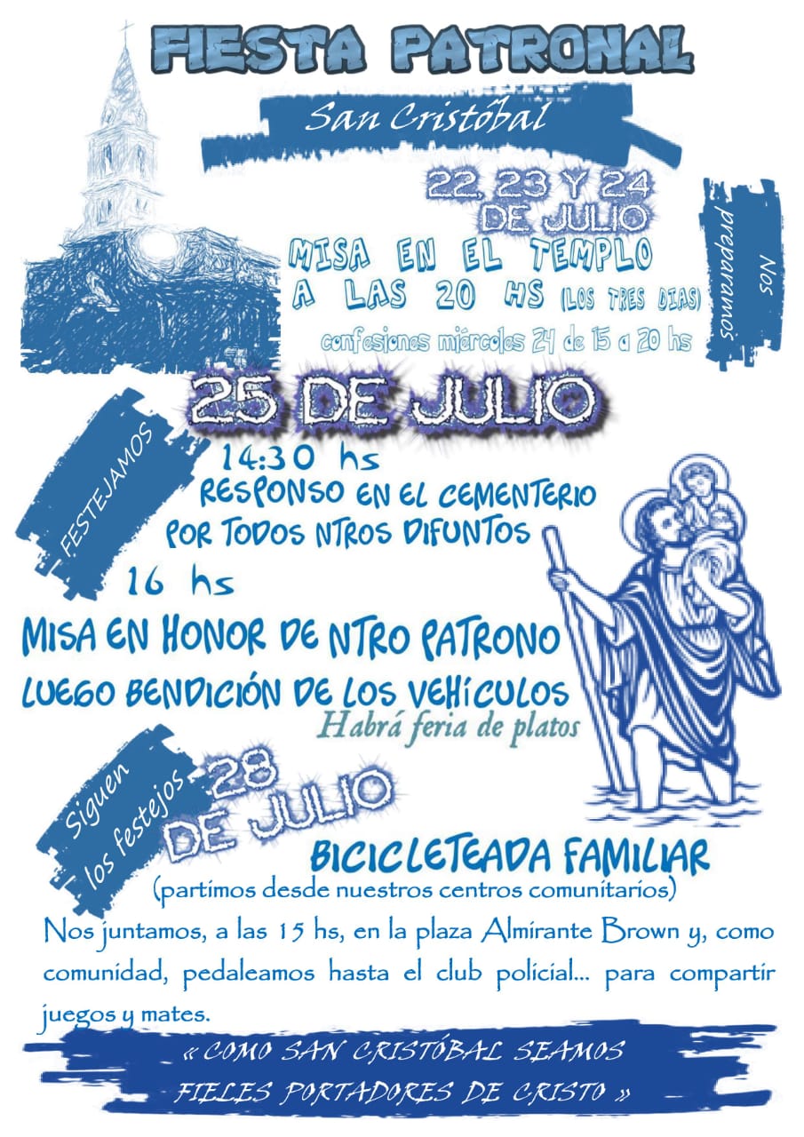 San Cristóbal: Patrono de la ciudad 24 julio, 2019 Mañana se celebra el día del santo patrono de nuestra ciudad, y desde la parroquia invitan a toda la comunidad a sumarse a las actividades que se tienen previstas.