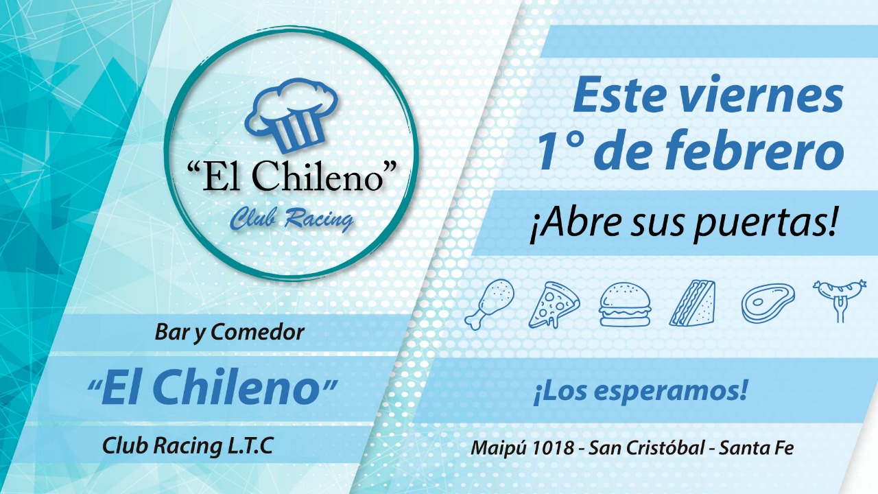 Se inaugura el bar y comedor «El Chileno» 1 febrero, 2019 El frente del Racing LTC abre sus puertas a partir de esta noche para todo el público, la iniciativa del club la llevará adelante Lorena Barria. Reservas para la inauguración: (3408) 673119.