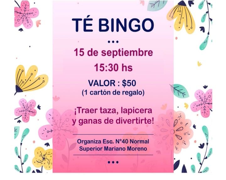 La Escuela Normal Superior Mariano Moreno organiza para este domingo, a partir de las 15.30hs en la institución escolar un te bingo para todo el público, con una entrada de $50 para mayores y $25 para menores. Hay tiempo hasta el día del evento para comprar los cartones, que tienen diferentes premios en juego.