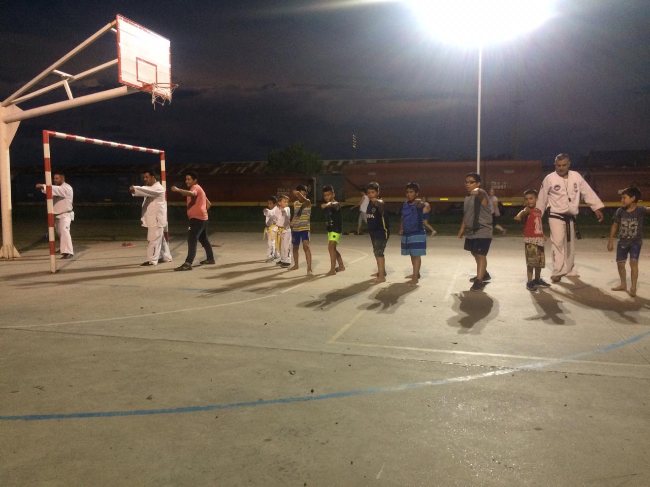 El profe Leonardo y los detalles de Taekwondo, una de las disciplinas que se desarrollan en el playón municipal.